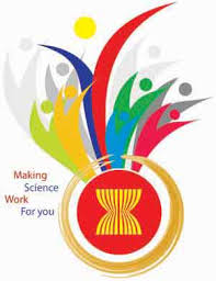สัญลักษณ์ของอาเซียน คือ รูปรวงข้าว สีเหลืองบนพื้นสีแดงล้อมรอบด้วยวงกลม สีขาวและสีน้ำเงิน